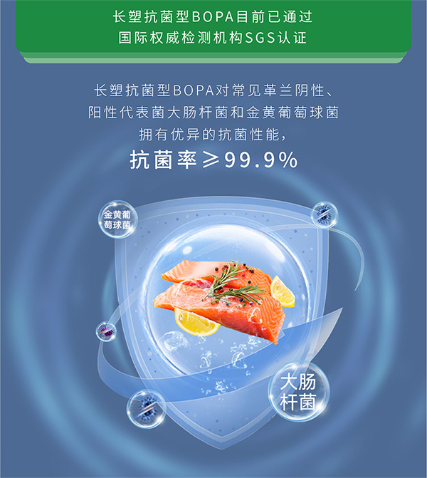 長塑抗菌型BOPA對常見革蘭陰性、陽性代表菌大腸桿菌和金黃葡萄球菌擁有優(yōu)異的抗菌性能,抗菌率≥99.9%。